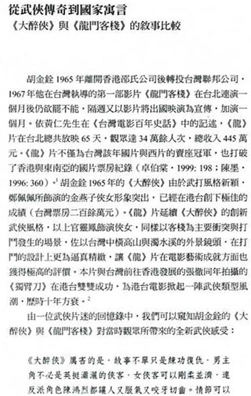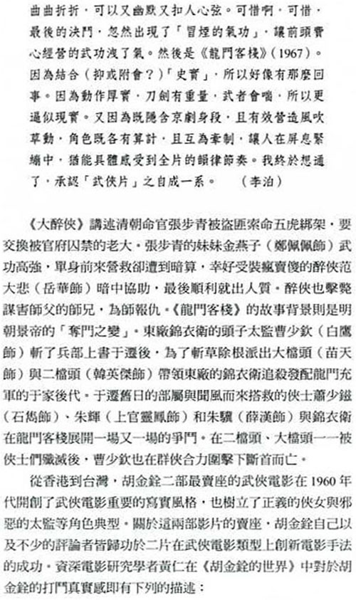 【本文原刊《放映週報》第429期,作者曾對胡金銓導演的《龍門客棧》,及另一部作品《大醉俠》敘事風格進行比較分析,〈從武俠傳奇到國族寓言:《大醉俠》到《龍門客棧》的敘事比較〉,全文收錄在本館出版之《華語電影中的國家寓言與國族認同》書中,茲摘錄部分內文如后,供讀者參閱。】(編者)